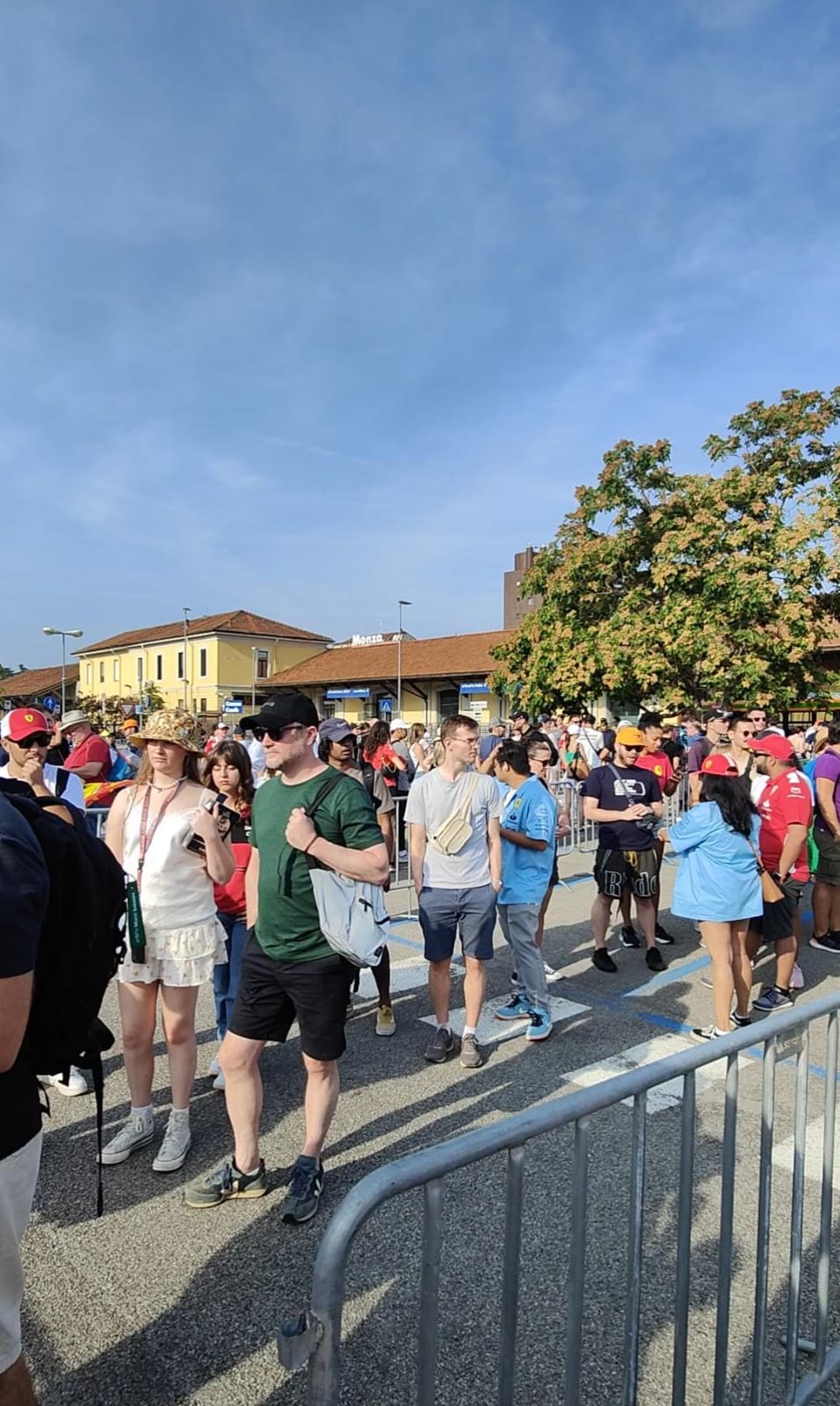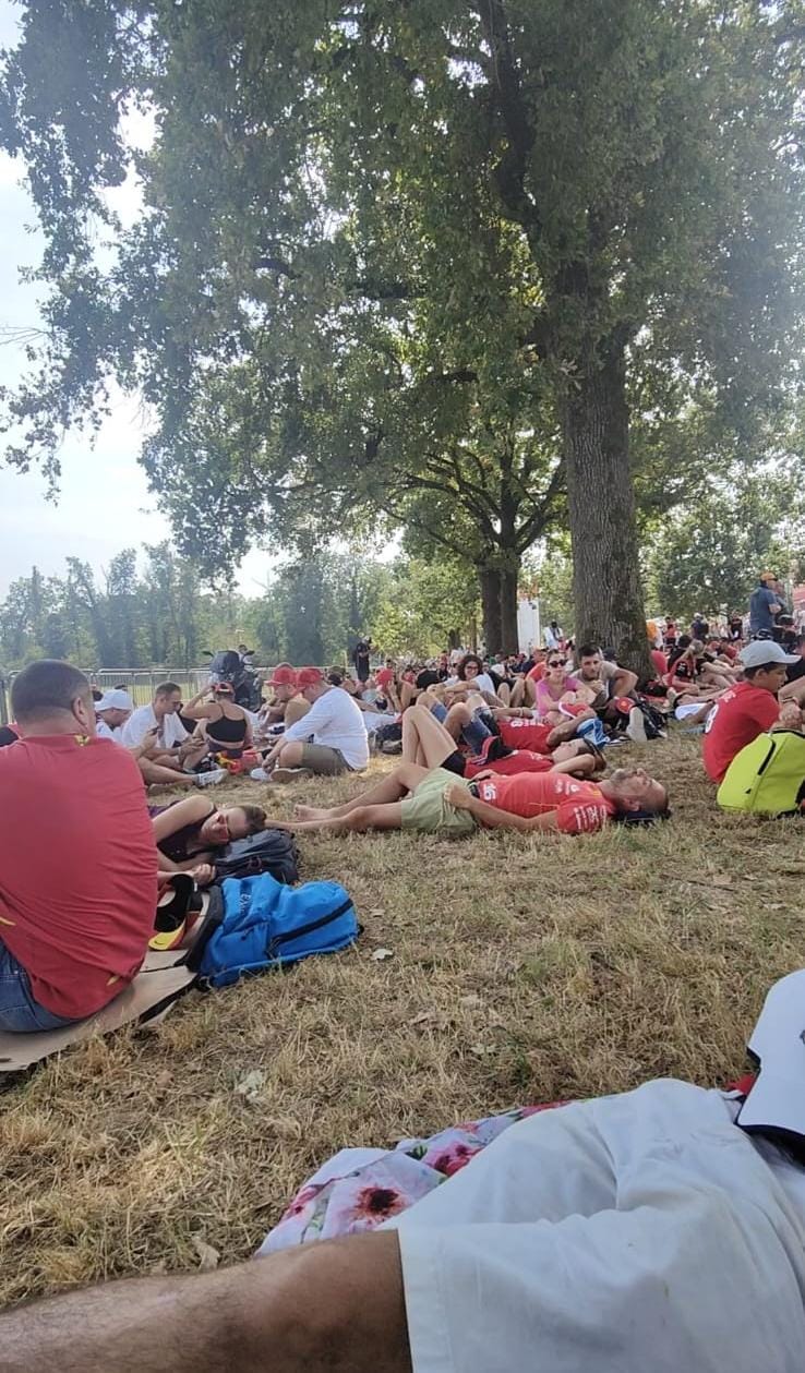 Una vez que llegas al parque de Monza, empieza la aventura a pie. Aunque creas estar cerca, prepárate para una caminata larga bajo el sol intenso del verano italiano. El lugar es enorme y no hay mucho personal para orientarte, así que vale la pena tener claro desde antes por qué puerta debes entrar. Eso sí, no te preocupes demasiado: si te unes a la impresionante marea roja de tifosi, tarde o temprano llegarás. Ellos son la mejor brújula.