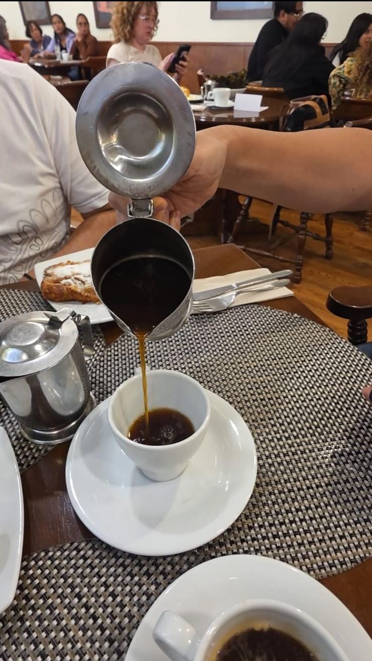 Pedimos el famoso tinto colombiano, ese café negro e intenso que te sirven directo de una jarrita metálica humeante. El aroma es profundo, tostado, delicioso. Perfecto para despertar el cuerpo después del vuelo.