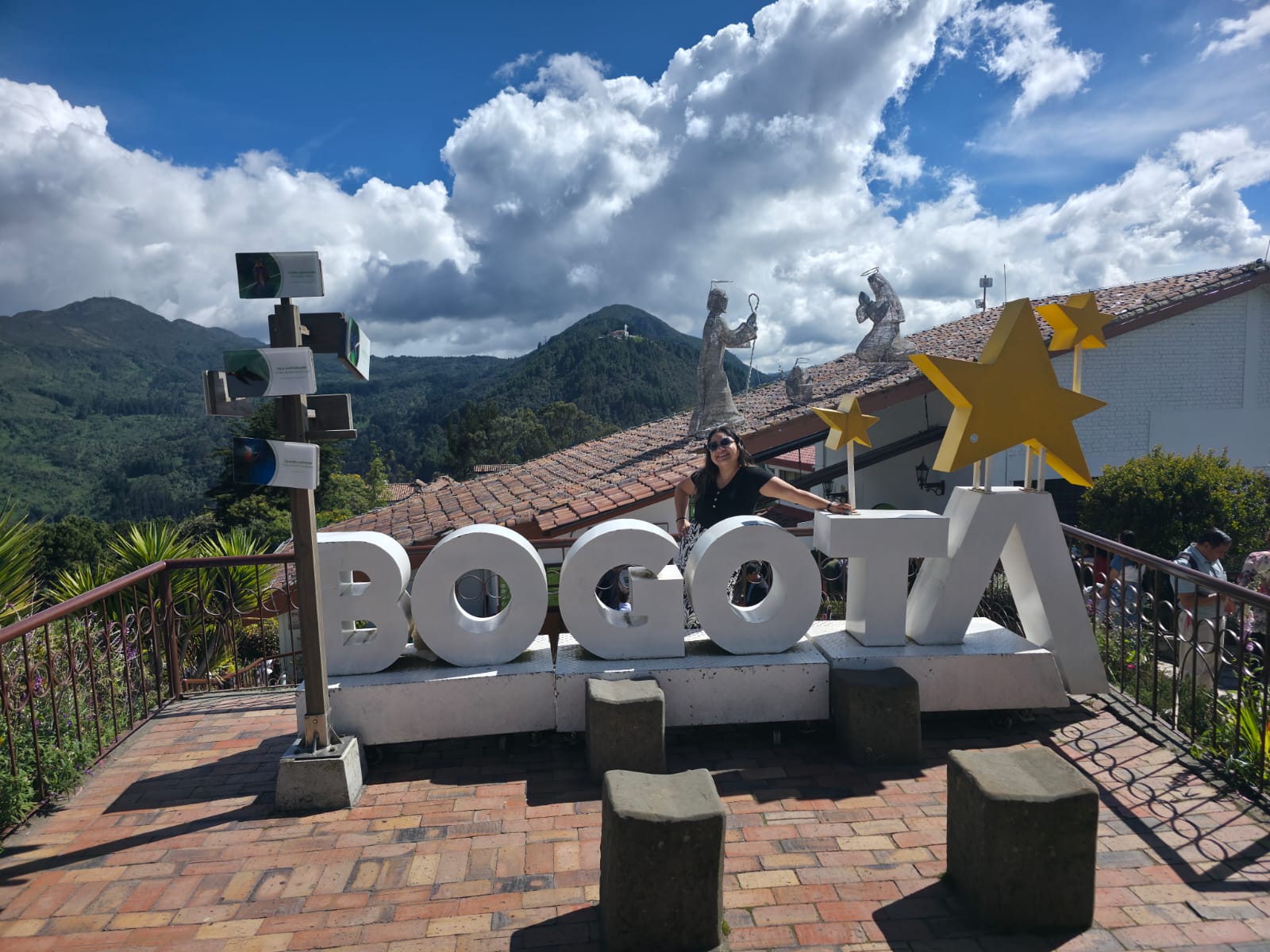 Arriba, el clima estaba increíble: cielo azul, nubes marcadas y una luz perfecta para disfrutar la vista. Entre flores, caminos coloniales y ese letrero gigante de “BOGOTÁ”, el ambiente es alegre y muy fotogénico.