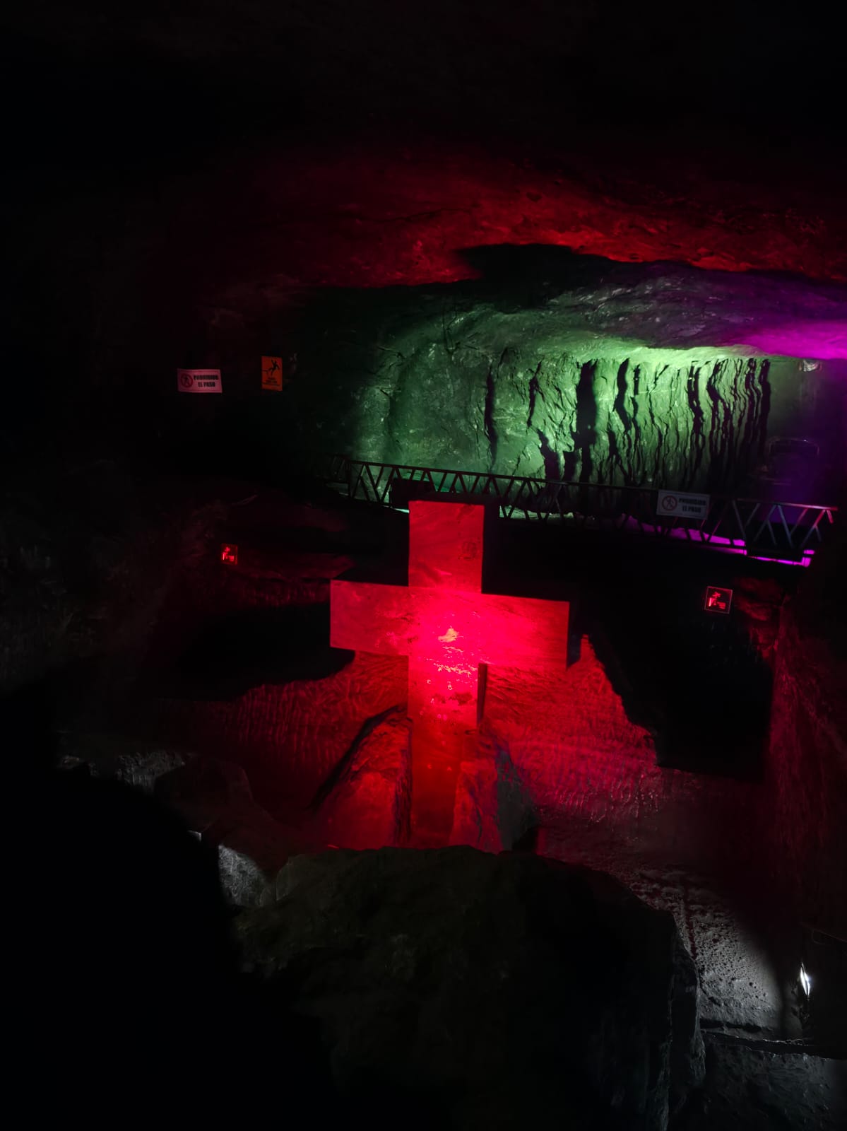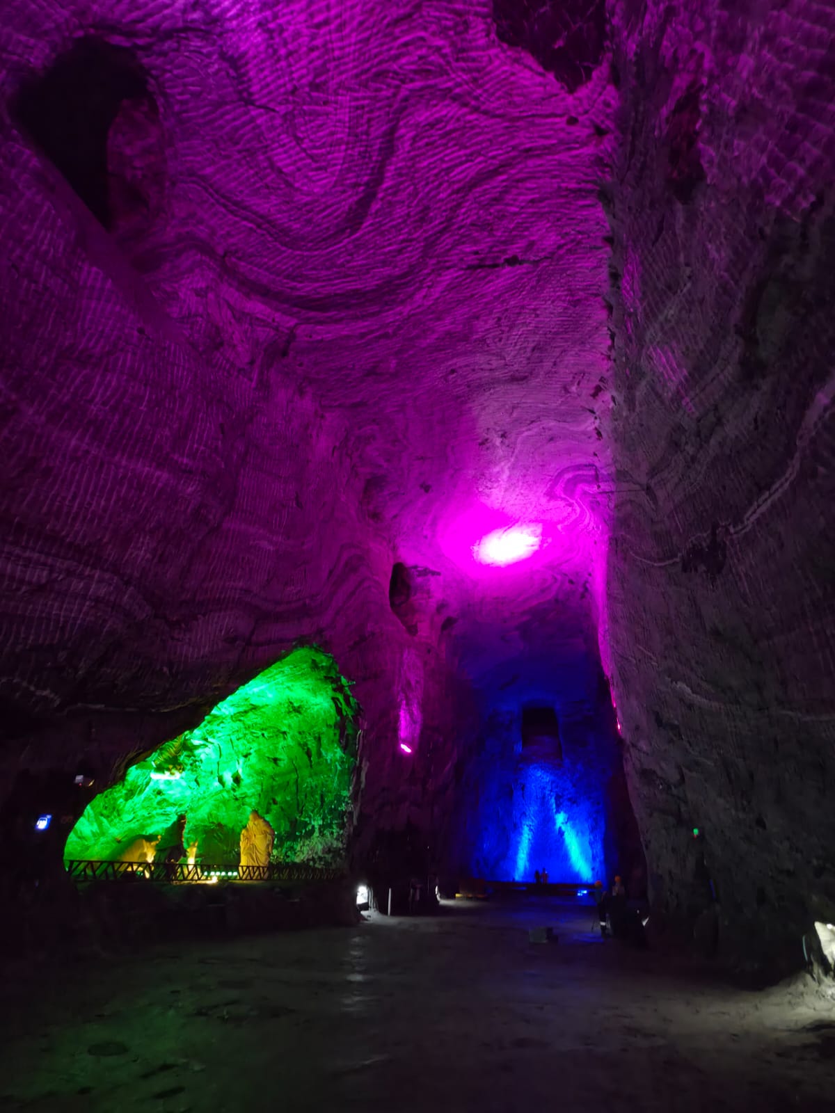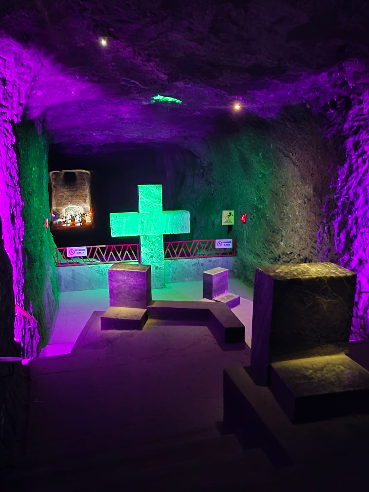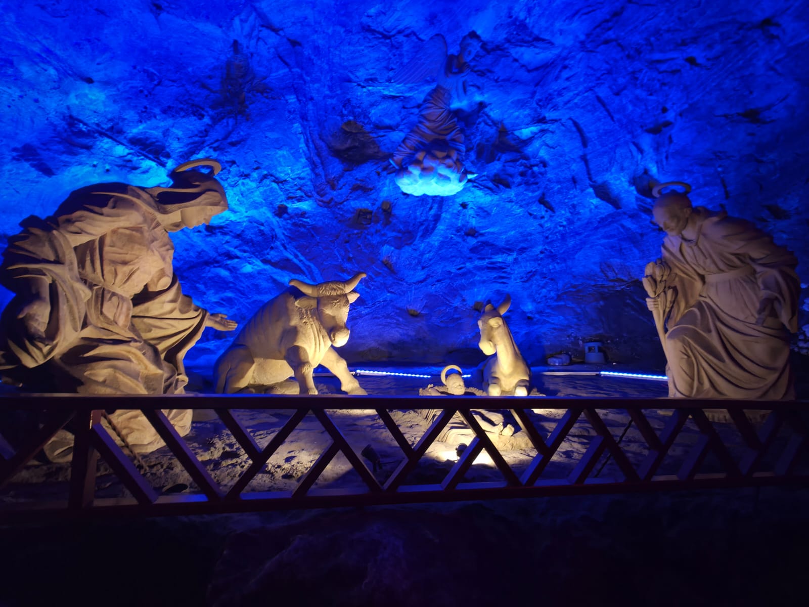 Cada estación del Vía Crucis tallada directamente en la roca salina te envuelve con una mezcla increíble de colores —morados, verdes, azules intensos— que iluminan las texturas de las paredes como si la propia tierra respirara. Las cruces gigantes, las esculturas y la profundidad del lugar hacen que todo se sienta solemne, casi místico. Uno de mis momentos favoritos fue estar frente al nacimiento de tamaño real, perfectamente iluminado, donde el silencio se vuelve protagonista y te obliga a contemplar el lugar con calma.