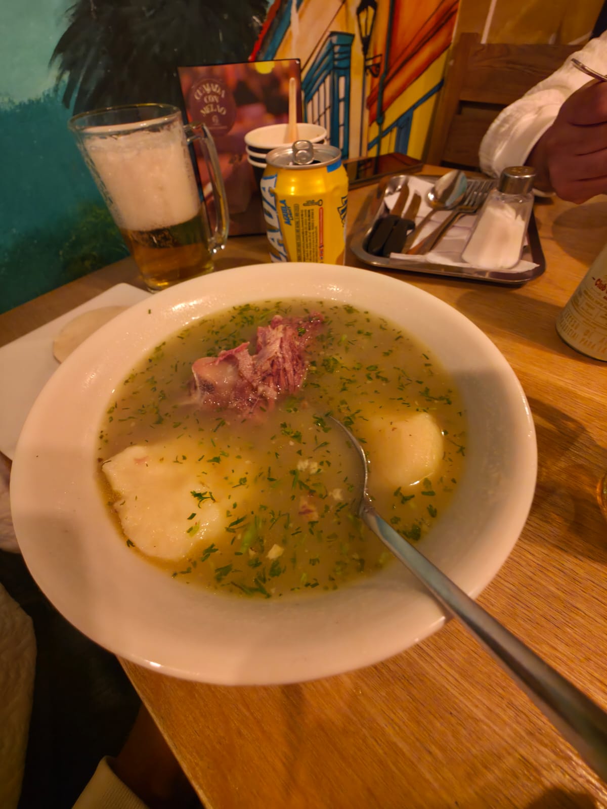 Más tarde, mientras recorríamos el centro histórico, hicimos una parada en Puerta de la Tradición, donde probamos el famoso caldo de costilla, un plato típico de Bogotá que se toma mucho en la mañana. Calientito, reconfortante y lleno de sabor, con papa, cilantro fresco y una costilla que prácticamente se deshacía sola. Fue justo lo que necesitábamos para seguir caminando.